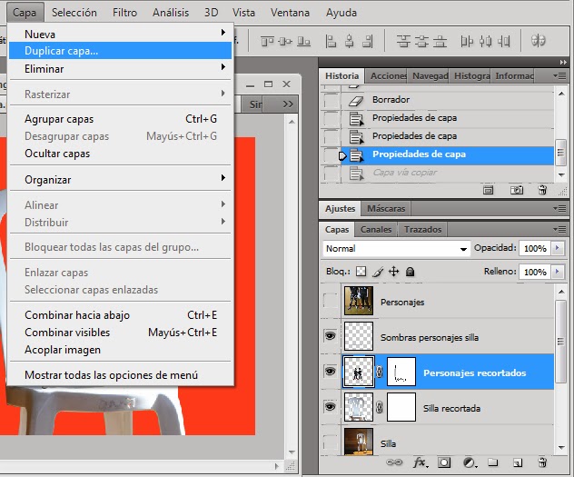 Como ves, en la imagen del ejemplo anterior, he hecho una impresión de pantalla para que se vea el proceso. Como está desplegada la paleta historia y capas, aparece de qué manera se ha desarrollado el trabajo. Si lo crees necesario, para que se vea la ejecución del ejercicio, puedes adjuntar la impresión de pantalla.